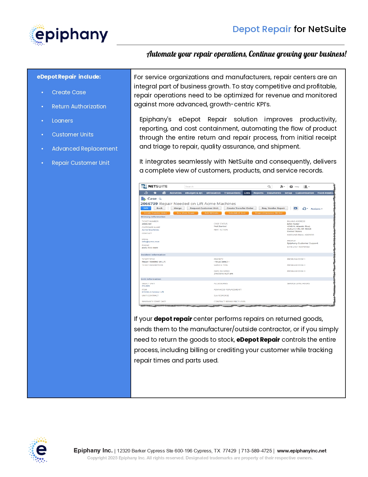 Because e-Depot Repair is built entirely inside NetSuite, organizations benefit from:
